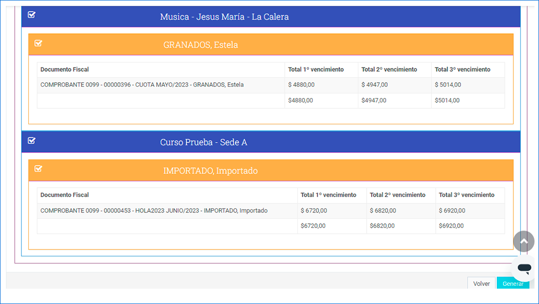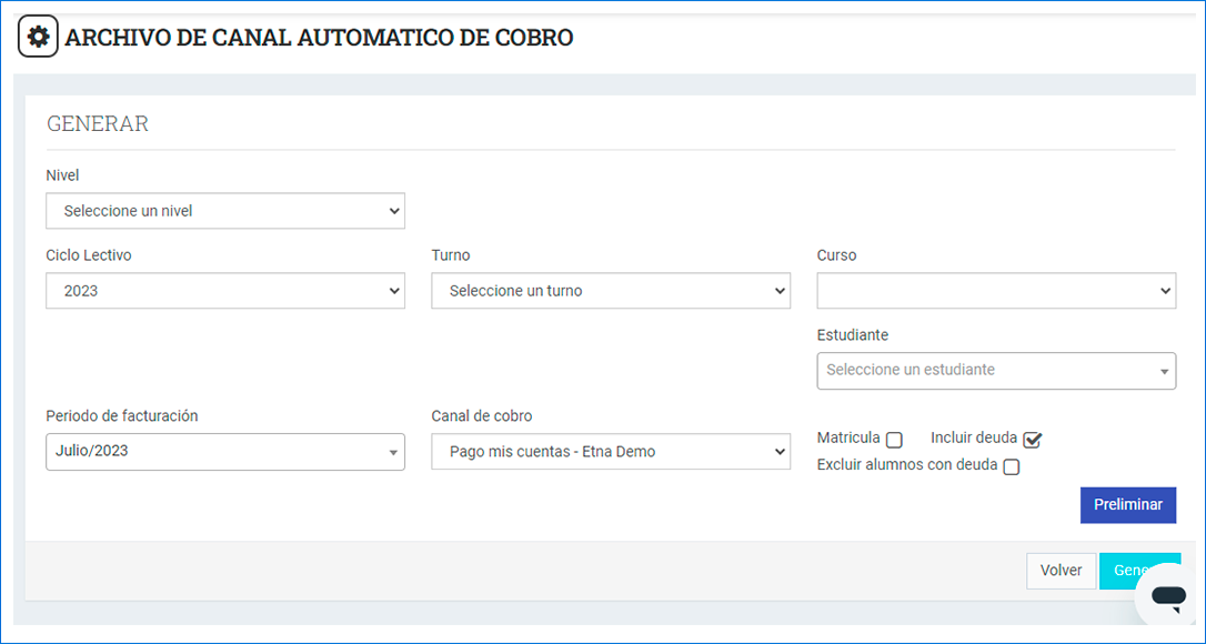Además se puede seleccionar el check de matrícula (permite subir la deuda de matrícula), incluir deuda (se incluyen cobranzas anteriores que se deben) o excluir alumnos con deuda (no se incluyen facturas de estudiantes que tengan deuda anterior).