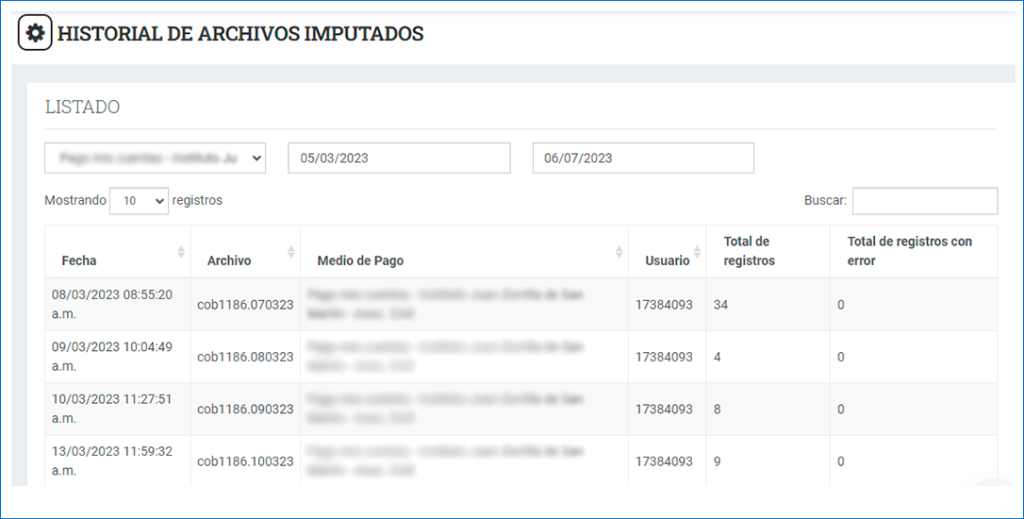 Desde esta pantalla se pueden ver los archivos históricos imputados por una entidad de cobros automáticos. Para ello se debe seleccionar la casilla desplegable de medio de cobro y las fechas desde y hasta para filtrar los archivos imputados.
