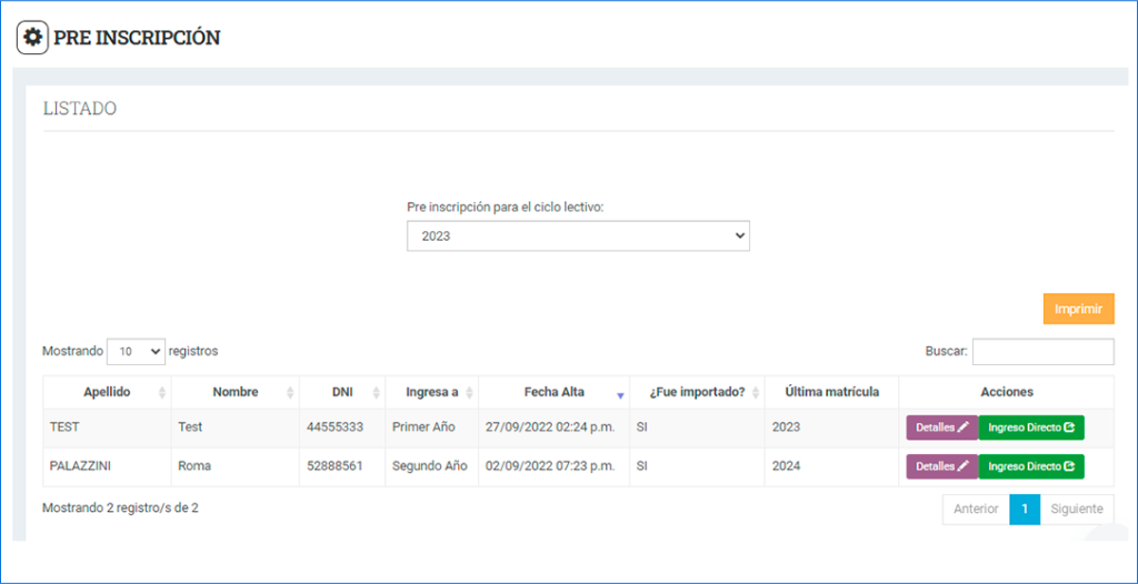 - Generar desde imprimir un excel con el listado de estudiantes pre-inscriptos al ciclo lectivo seleccionado con todos sus datos completos