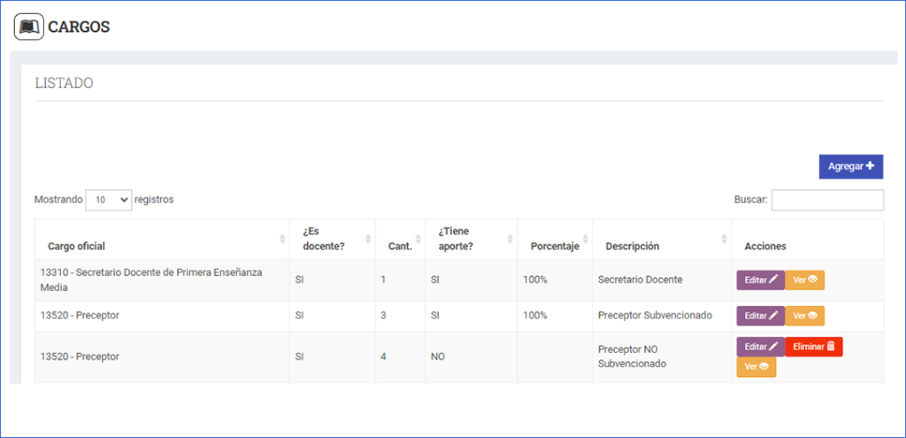 Desde la pantalla principal se pueden consultar editar, agregar, ver o eliminar los cargos creados para la institución.