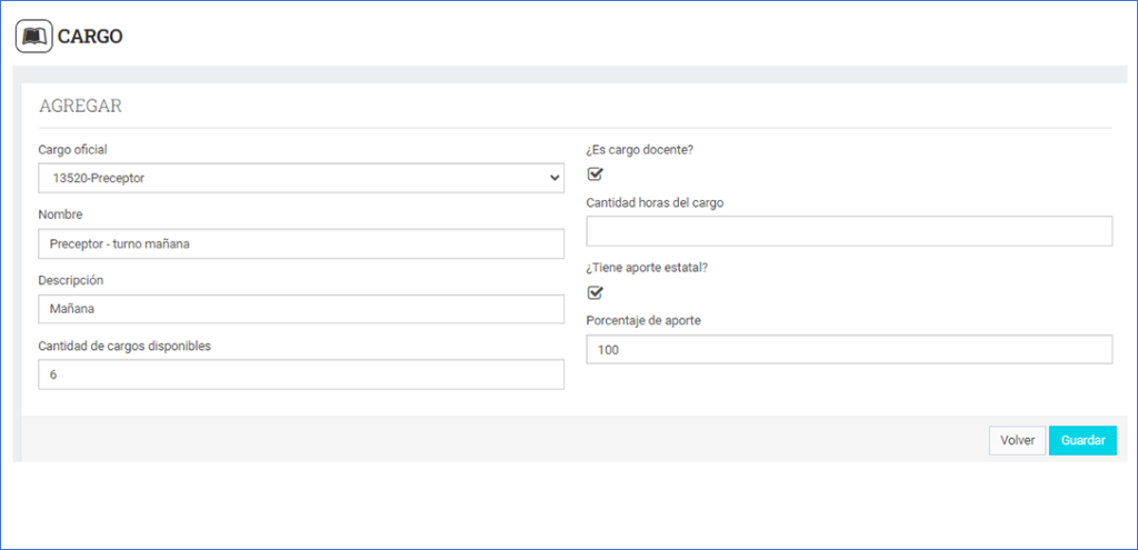 - Nombre : Se coloca el nombre que se le puede dar a ese cargo dentro de la institución. (ej preceptor turno mañana- preceptor turno tarde). Se permiten identificar cargos del mismo tipo.