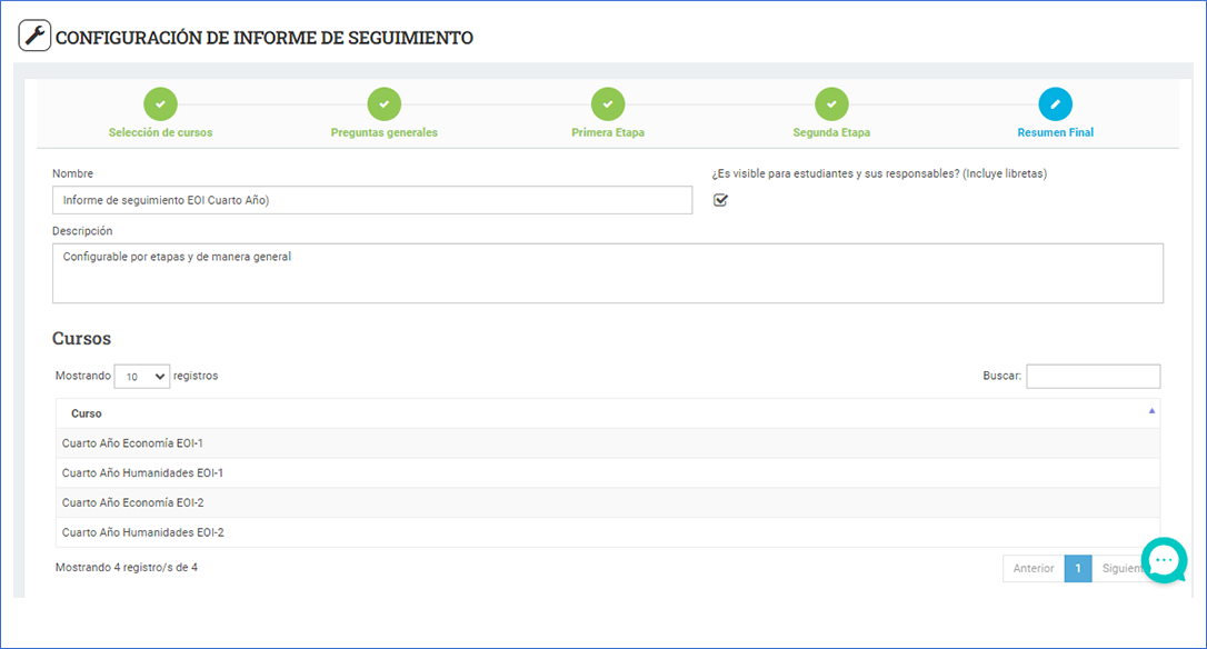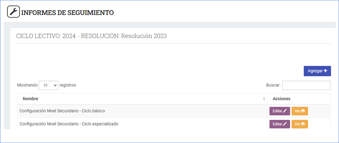 Desde la pantalla principal se pueden editar o ver las configuraciones de informes ya creadas. También se puede agregar un nuevo informe (pueden crearse más de un informe, incluso más de uno por curso o materia )