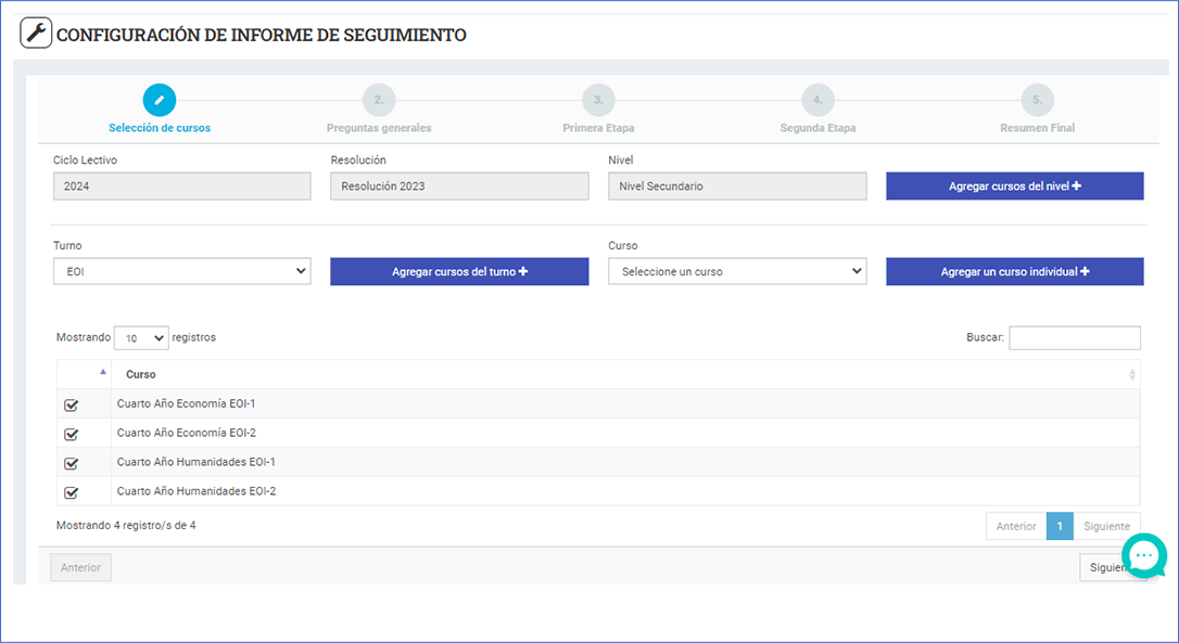 - Desde agregar cursos del nivel se pueden agregar todos los cursos del nivel particular, si se selecciona agregar cursos del turno, se agregan todos los cursos del turno seleccionado. Por último se puede seleccionar la opción de agregar un curso individual. En todos los casos se aplicarán las configuraciones cargadas para todas las materias de cada uno de los cursos seleccionados, ya que la configuración de informes se realiza siempre por materia.