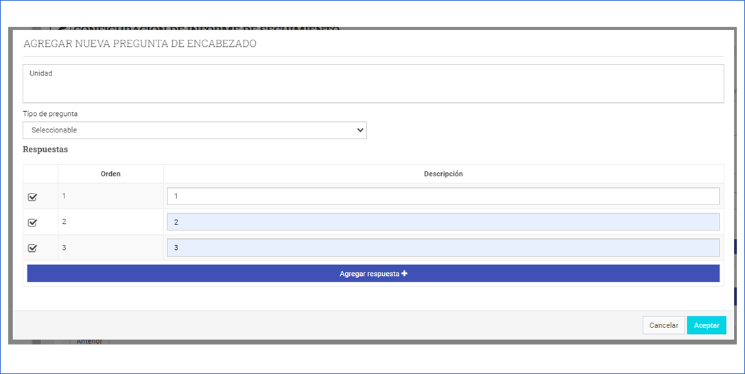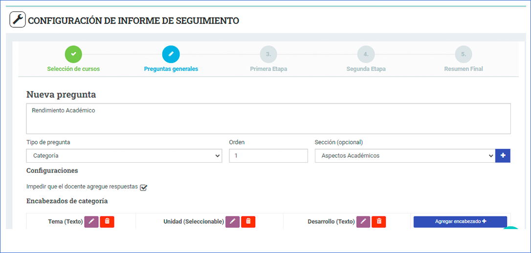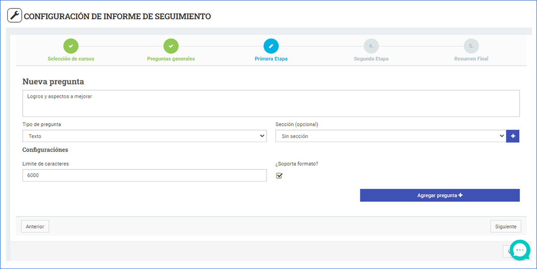 Desde esta sección se configura la/s pregunta/s general/es del informe
