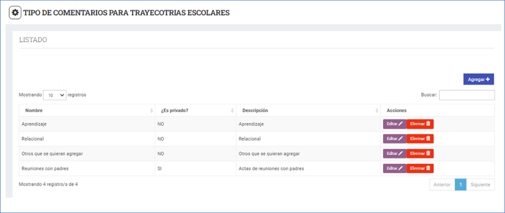 Desde esta pantalla se visualizan los tipos de comentarios para trayectorias escolares ya creados, se puede editar y/o eliminar a los mismos.