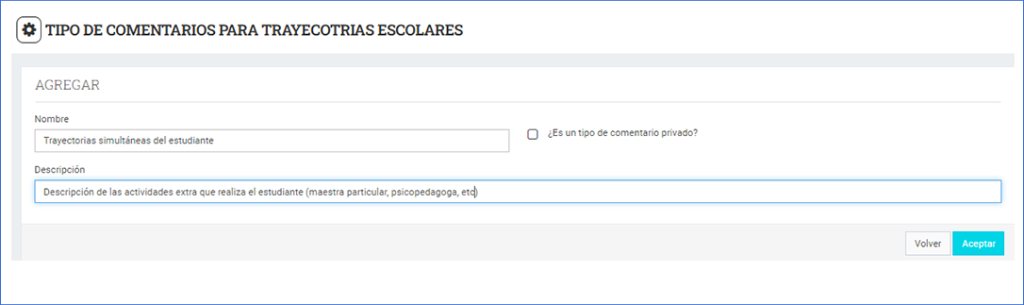 - ¿Es un tipo de comentario privado?. Seleccionando este check, se puede decidir si estos son privados (quedarán internamente para el equipo directivo) o públicos (los profesores pueden visualizar los comentarios)