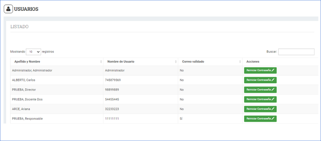 Desde la pantalla principal desde buscar a un usuario particular cargado en el sistema, consultar si los usuarios tienen o no validado el correo electrónico y seleccionar reiniciar contraseña de acceso al autogestión.