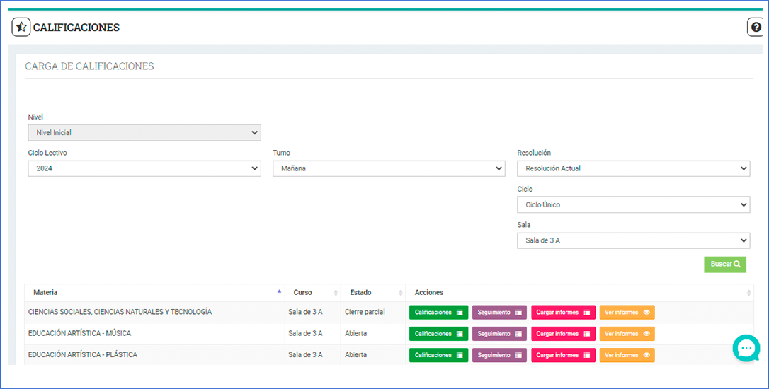 Desde la pantalla principal se debe filtrar la sala específica. Luego se puede ver la materia, la sala y el estado de la misma (abierto, cierre parcial y cierre total). Así como también cargar notas e informes y ver las notas e informes ya cargados.