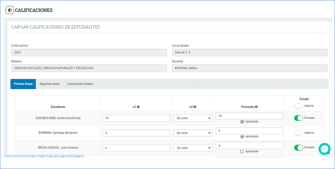 Se puede cerrar la etapa, esto se puede realizar de manera masiva, deslizando el botón que se encuentra abajo de estado, o estudiante por estudiante en la misma columna .Dependiendo de las configuraciones se pueden agregar notas numéricas o cualitativas en los campos opcionales por etapa (en el caso de las notas cualitativas manuales el docente deberá indicar si la calificación está aprobada o no).