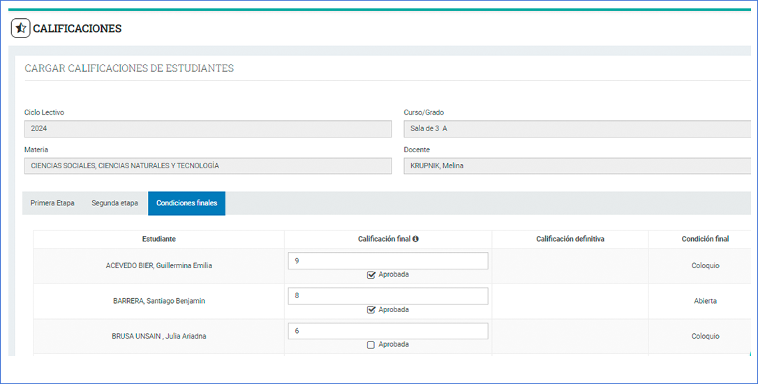 Se carga o edita la calificación final por estudiante. Únicamente para las calificaciones cualitativas manuales se debe seleccionar el check indicando si la condición se encuentra aprobada o no.
